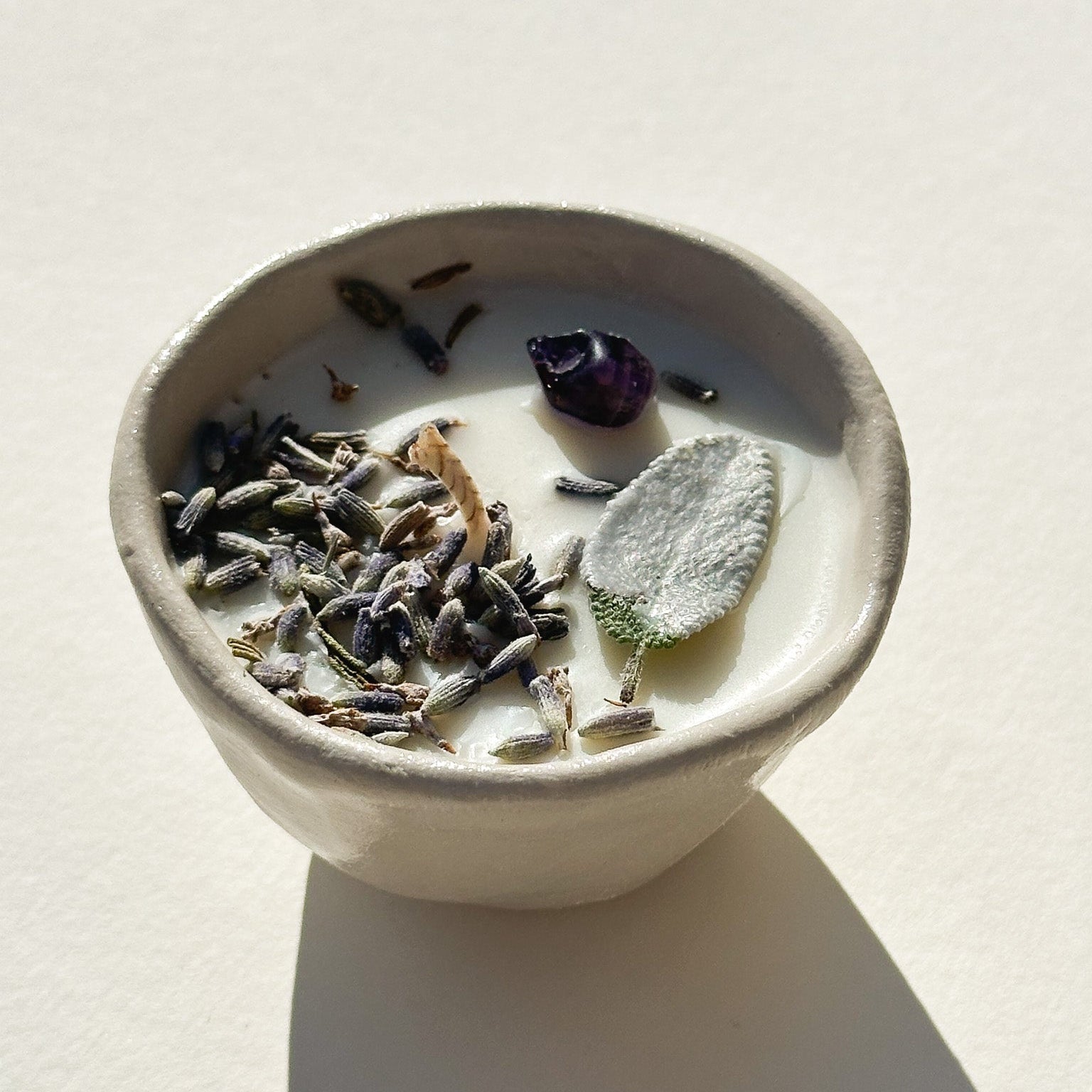 Each candle is topped with an amethyst, traditionally associated with calm and clarity, alongside English lavender and clary sage, thoughtful additions that reflect the soothing intention behind the blend.