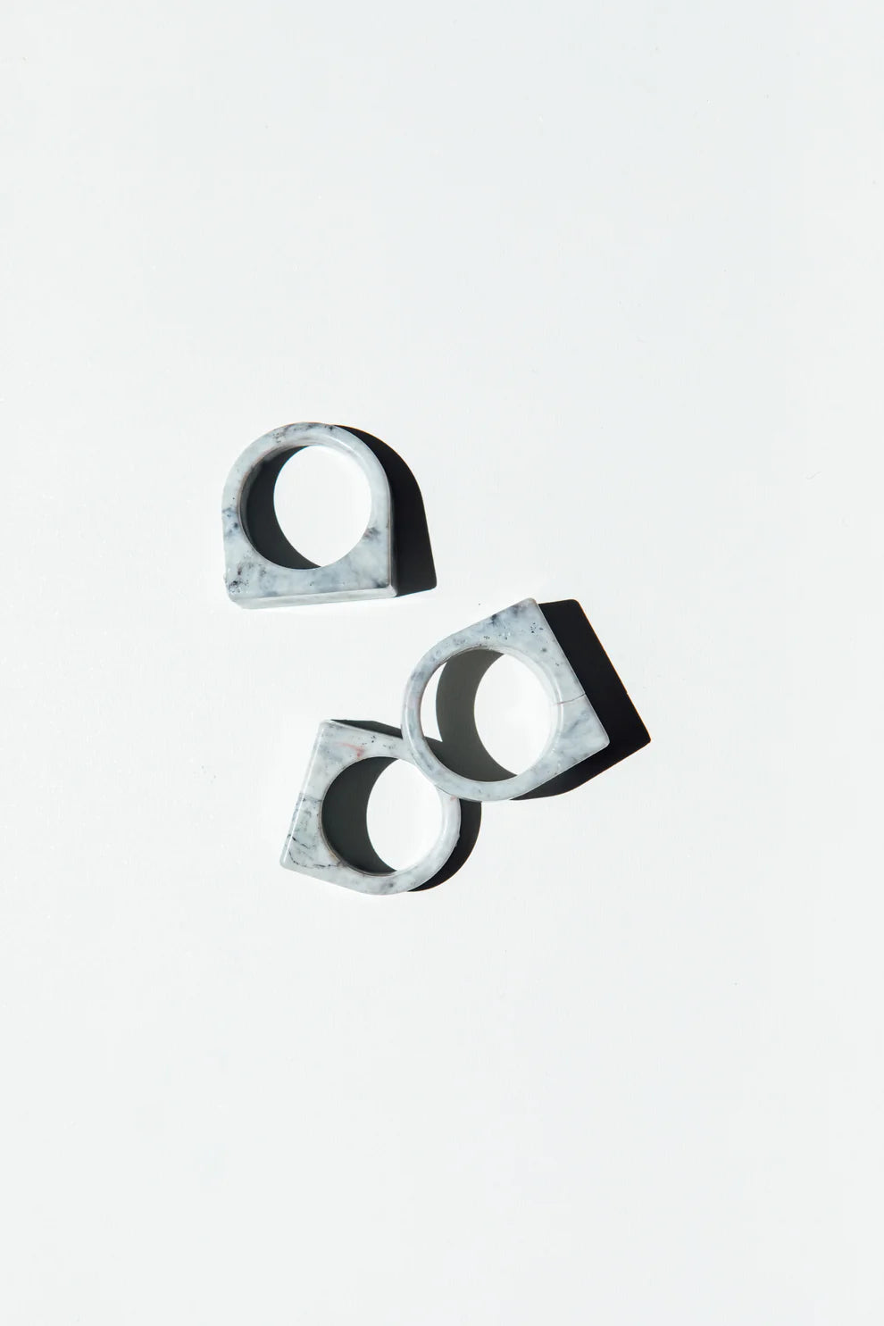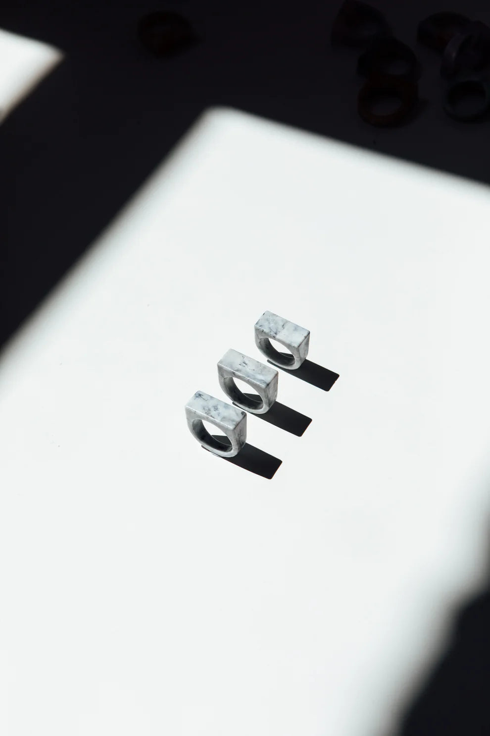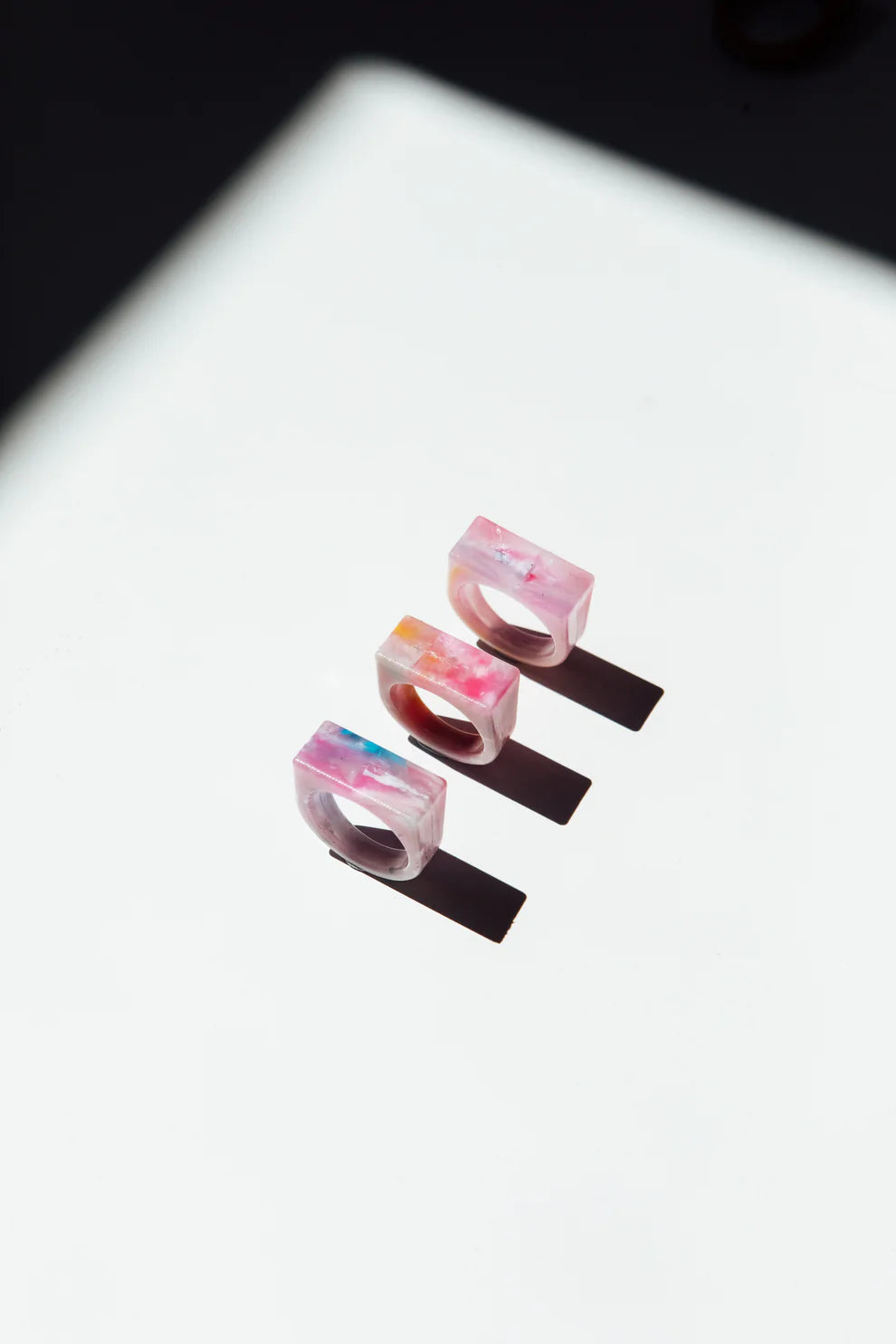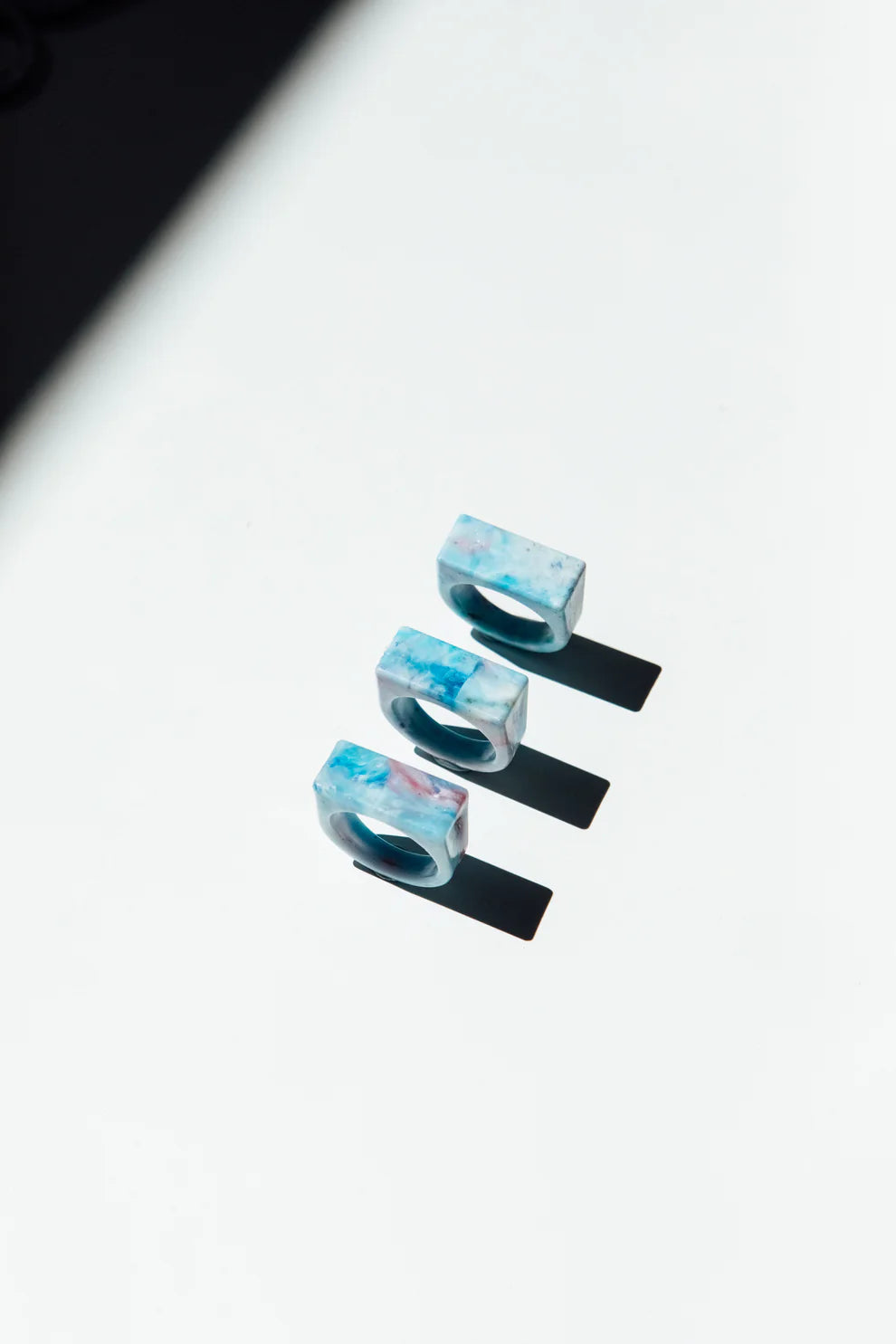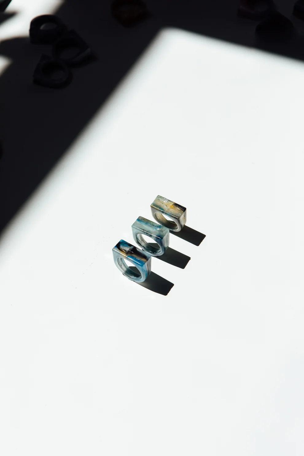 Marble: This ring has been made with a selection of plastics, gold lids, deep blues, black containers and dark greens, all creating this stunning marble effect. This ring has been created with single use, household plastic waste. Every ring will be slightly different and unique to you, as no ring is the same due to the transformative recycling process.