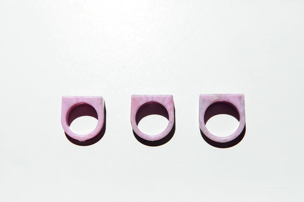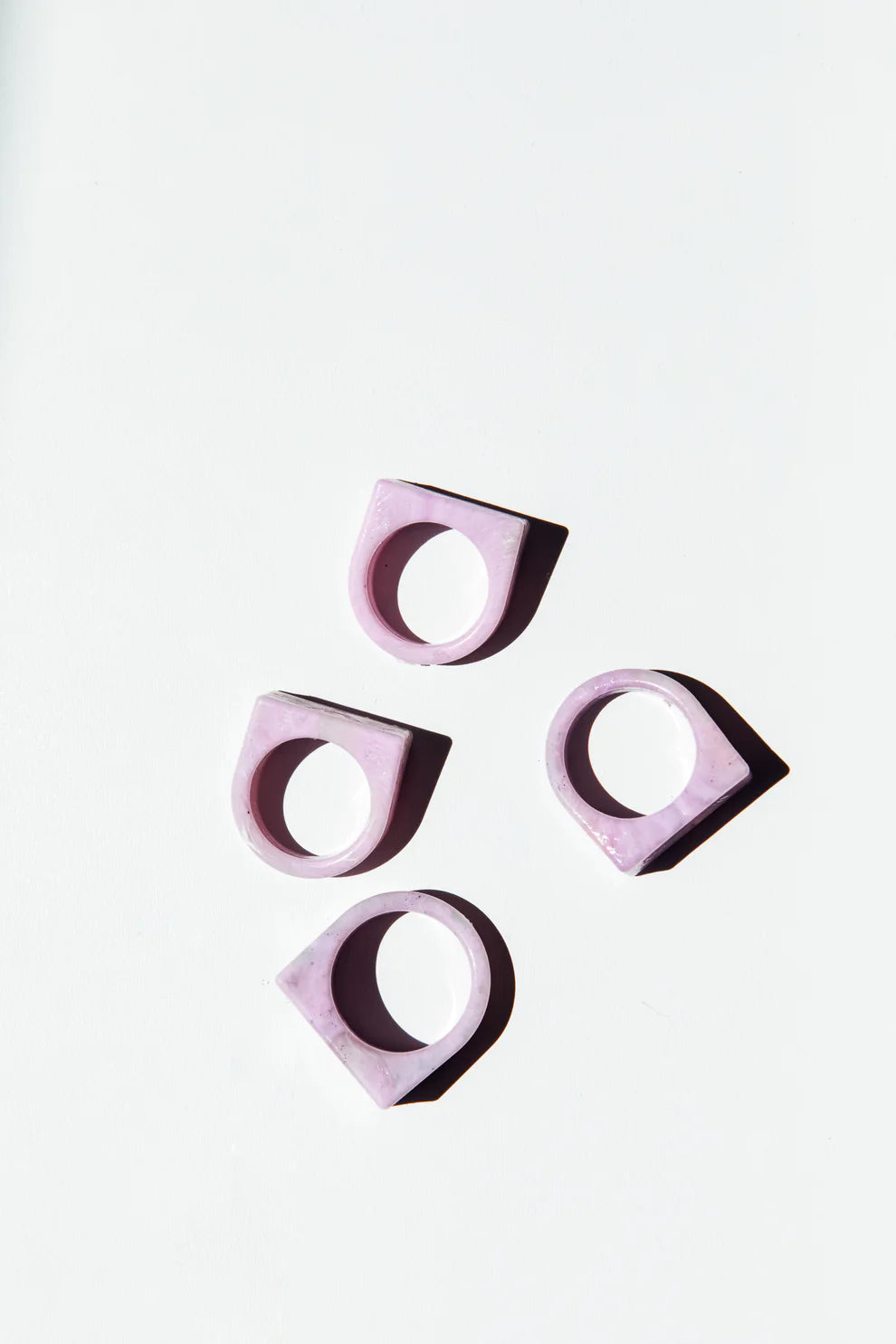 Parma Violets: This lilac blend has been created with just two types of plastic from one baby food product. This ring has less ripples than the other blends and is a more solid lilac, creating a bold ring perfect for Summer.
