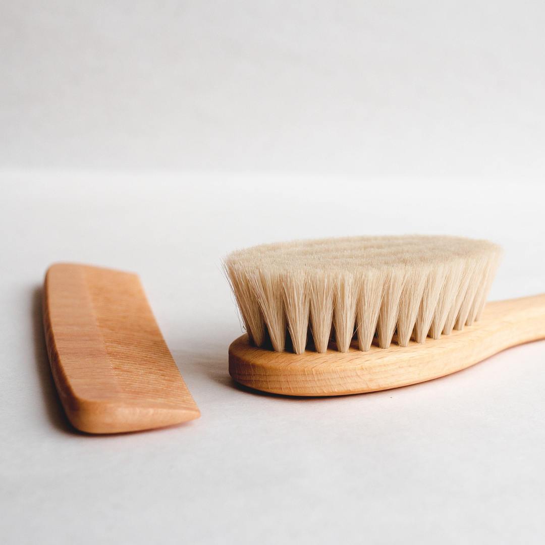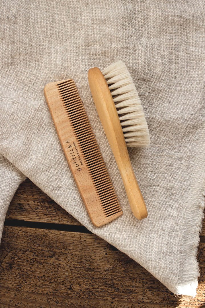 With soft natural bristles and a smooth beech wood handle, this delightfully dinky baby hairbrush is specially designed to care for your little one's delicate hair and scalp. The comb is also great for everyday use for both kids and adults.