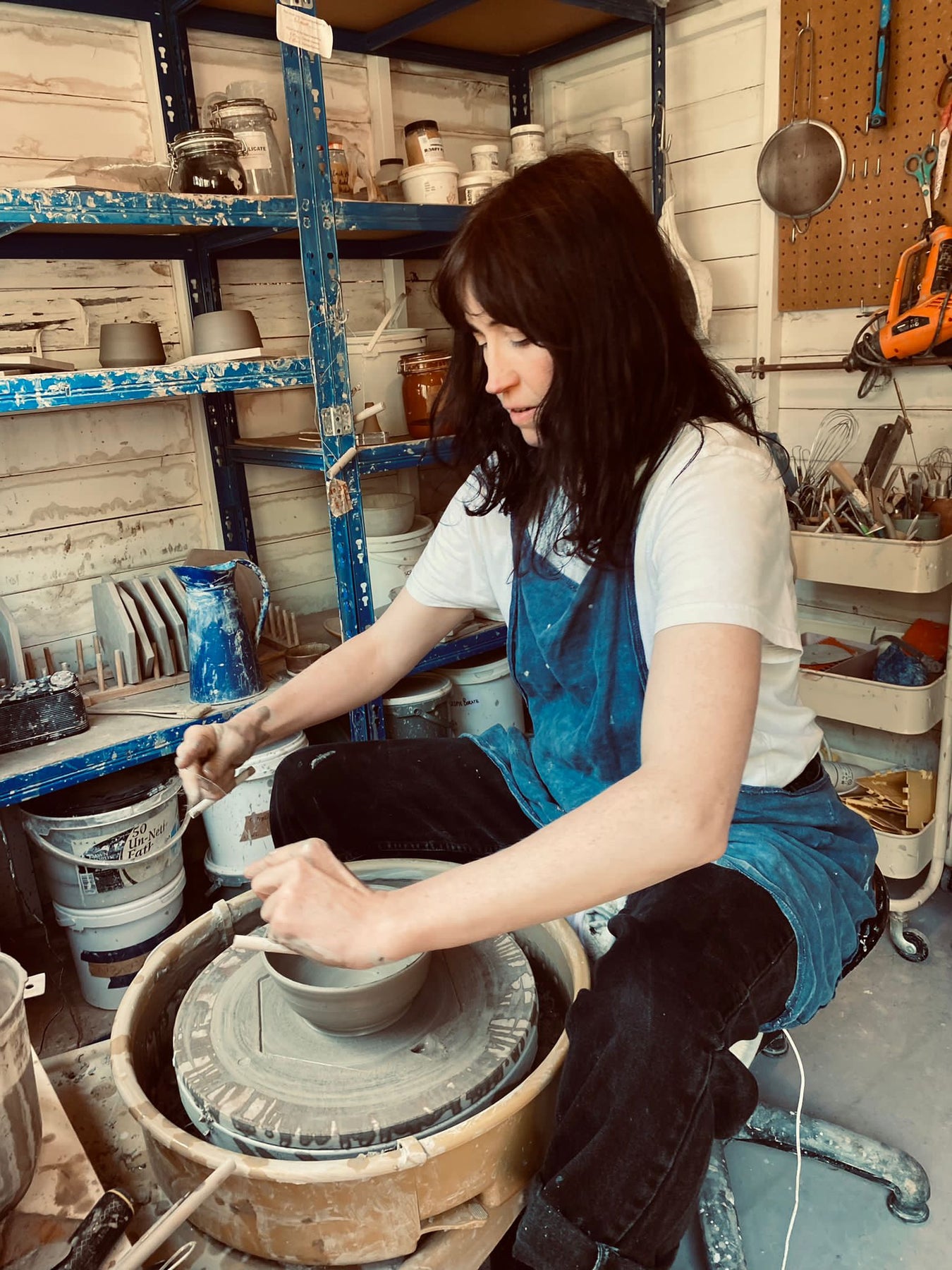 Hi I'm Sarah Daly - I’m a musician and ceramicist born in London and now living in Cliftonville, Margate. For 20 years I’ve been playing in indie band Scanners with my partner Mat and we compose music and create sound design for Film and TV, commercials and fashion brands. I'm now happier making functional ceramics in my home studio in Margate. I am inspired by the beautiful coastal horizons where I live. My pieces have simple angular forms with horizontal lines either carved into the clay or hand painted. My usual colour pallet ranges from black and white to yellow and turquoise. These colours change when using different coloured clays underneath. So I like to use a range of clays from white to dark brown. I then hand paint oxides and underglazes onto the clay. I add wood ash from nearby Blean wood to some of my glazes too.
